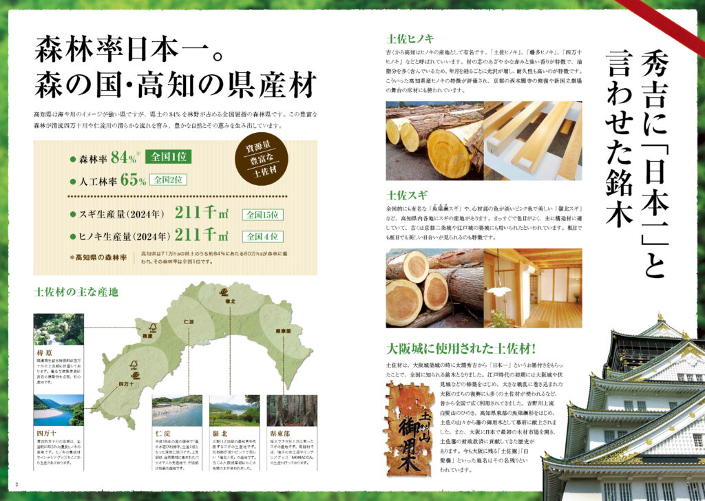 高知の木の品質は、歴史が証明しています。安土桃山時代、大坂城の建設にあたって、その堅牢さと美しさから建材として指名されたのが土佐の巨木でした。吉野川上流白髪山のひのき、高知県東部の魚梁瀬杉をはじめ、土佐の山々から藩の御用木として幕府に献上されました。また、大阪に日本で最初の木材市場を開き、土佐藩の財政救済に貢献してきた歴史があります。